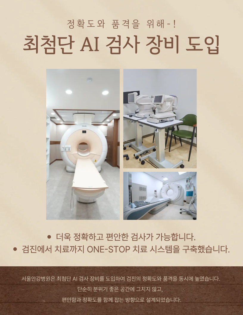 편안함만으로는 검진이 완성되지 않습니다. 검진은 결국 정확도에 대한 신뢰가 기반이 되어야 합니다. 서울안강병원은 이를 위해 최첨단 AI 검사 장비를 도입하여 검진의 정확도와 품격을 동시에 높였습니다. 단순히 분위기 좋은 공간에 그치지 않고, 편안함과 정확도를 함께 잡는 방향으로 설계되었습니다. 서울안강병원이 꿈꾸는 변화는 거창한 말이 아닙니다. "이번 서초동 건강검진은 생각보다 덜 힘들었네?" "공간이 편해서 그런지, 시간가는 줄 몰랐어" "내년에도 여기서 받으면 좋겠다" 검진을 마치고 나오는 순간, 이런 감정이 남을 수 있도록 검진 자체가 힐링이 되는 공간을 만드는 것입니다. 서초동 건강검진은 잘 받는 것만큼, 꾸준히 받는 것이 중요합니다. 그러려면 검진이 힘든 기억이 아니라 좋은 기억으로 남아야 합니다. 서울안강병원은 2026년 2월, 검진 전용 신축 건물에서 서초동 건강검진의 경험을 새롭게 제시하겠습니다. 검진이 매년 기대되는 루틴이 되도록, 머무는 시간까지 편안한 건강증진센터를 경험시켜 드리겠습니다.