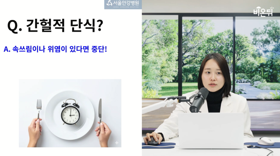 "검진을 넘어 치유로, 기다림 없는 골든타임의 실현" 서울안강병원 프리미엄 건강증진센터입니다. 간헐적 단식을 시작하고 “속이 편해졌다”는 사람도 있지만, 반대로 “속이 더 쓰리고 불편해졌다”는 사람도 있습니다. 같은 방법인데 왜 반응이 이렇게 다를까요? 이번 포스팅은, 의학채널 비온뒤 라이브 방송에서 언급했던 간헐적단식 효과에 대해 이야기 해보려 하는데요. 좋다, 안좋다 아직도 의견이 분분만 간헐적단식 효과에 대해 정확히 알려드리겠습니다.
