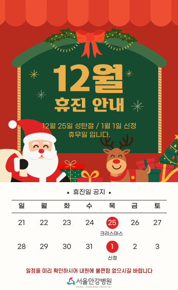 해당 일자는 휴진이며, 그 외 날짜에는 정상 진료합니다. 연말·연초에는 진료 일정이 비교적 빠르게 마감될 수 있어 내원 예정이 있으신 분들께서는 미리 예약과 일정 확인을 권해드립니다. 추운 날씨에 건강 유의하시고, 사랑과 행복 가득한 연말 보내시길 바랍니다. 서울안강병원은 새해에도 변함없이 여러분의 건강 곁을 지키겠습니다. 감사합니다.
