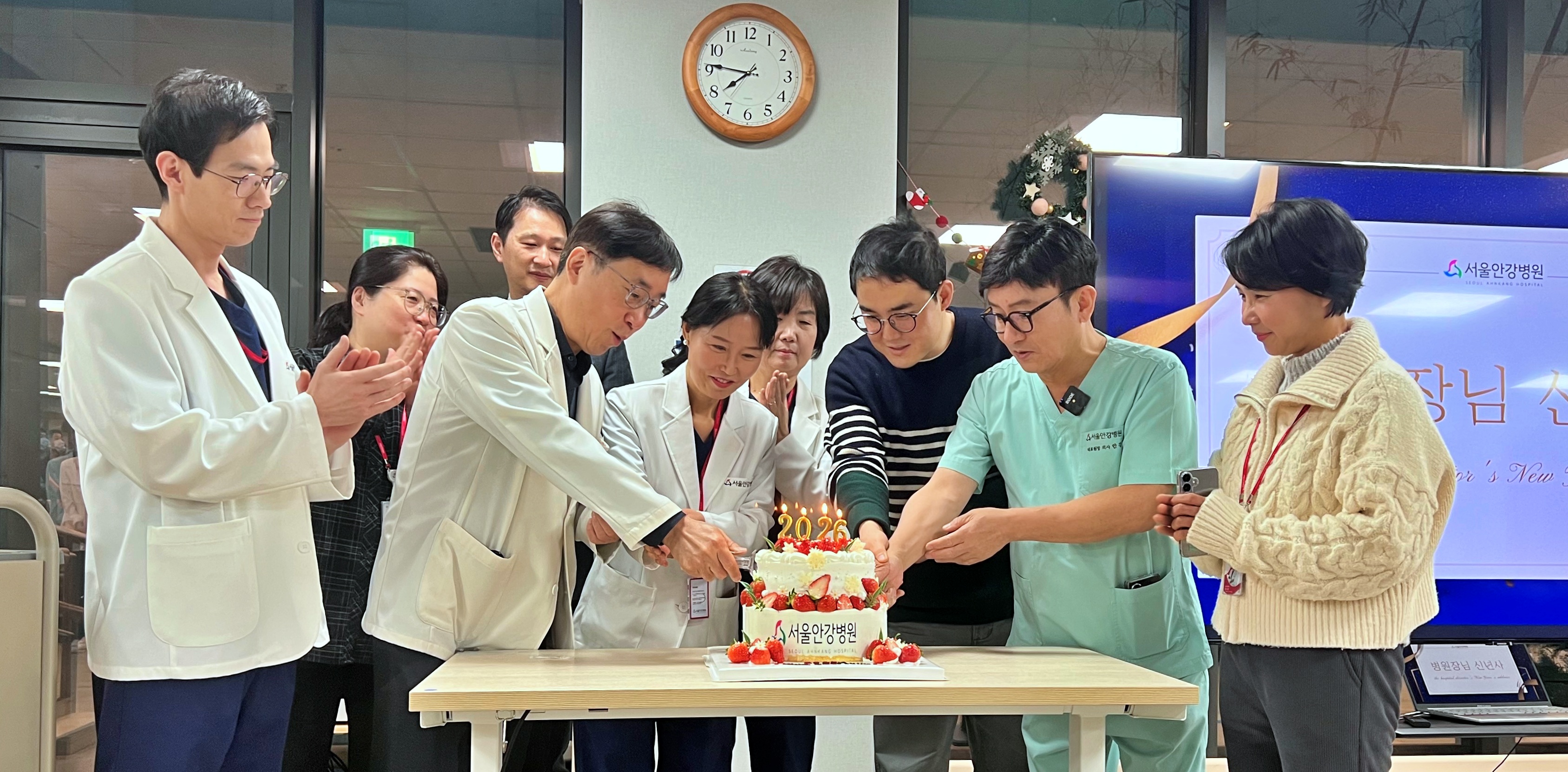 ![]() ![]() 시무식의 분위기를 한층 더 밝게 만든 시간은 검진권 추첨 이벤트였습니다. 이벤트를 통해 직원들 간의 웃음과 박수가 이어졌고, 건강의 중요성을 다시 한 번 되새기는 계기가 되었습니다. 이어 각 부서 부서장들과 병원장님이 함께하는 케이크 컷팅식이 진행되었습니다. 새로운 한 해의 시작을 기념하는 이 시간은 부서 간의 협력과 소통, 그리고 한 팀으로서의 결속력을 상징하는 순간이었습니다. 2026년, 더 단단해질 서울안강병원 이번 시무식은 단순한 행사를 넘어, 서울안강병원이 같은 방향을 바라보고 함께 출발선에 선 순간이었습니다. 2026년에도 서울안강병원은 환자 한 분 한 분의 삶에 진정으로 도움이 되는 의료를 제공하기 위해 임직원 모두가 한마음으로 노력하겠습니다. 새로운 한 해, 더 나은 내일을 향해 나아가는 서울안강병원을 기대해 주세요!
