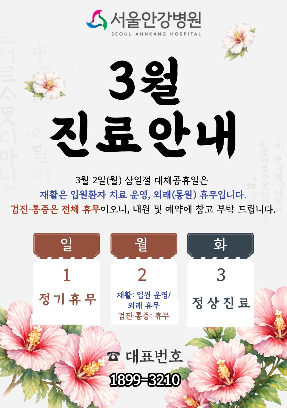 따뜻한 봄기운이 시작되는 3월, 삼일절(대체공휴일) 진료 일정을 안내드립니다. 내원 및 예약에 착오 없으시도록 아래 내용을 꼭 확인해주시기 바랍니다. 📅 3월 진료 일정 안내 ▶ 3월 2일(월)_삼일절 대체공휴일 - 재활센터: 입원환자 치료 정상 운영 / 외래(통원) 휴무 - 건강검진센터 · 통증센터: 전체 휴무 3월 2일(월) 대체공휴일은 부서별 진료 일정이 상이합니다. 소중한 걸음이 헛되지 않도록 내원 전 확인 부탁 드리겠습니다. 3월에도 서울안강병원은 여러분의 건강한 일상을 위해 최선을 다하겠습니다. 감사합니다. 🌿