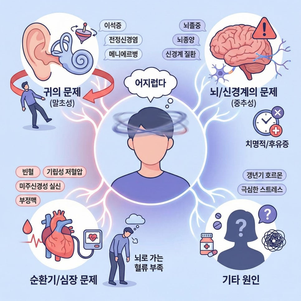 "어지럽다"는 느낌은 하나지만, 우리 몸이 균형을 잡는 시스템은 귀(전정기관), 뇌, 시각, 말초신경, 그리고 혈액순환까지 복잡하게 얽혀 있습니다. 이 중 어느 한 곳이라도 문제가 생기면 어지럼증이 발생합니다. · 귀의 문제 (말초성): 이석증, 전정신경염, 메니에르병 등. 주로 세상이 빙글빙글 도는 회전성 어지럼증이 많고 자세 변화에 민감합니다. · 뇌/신경계의 문제 (중추성): 뇌졸중(뇌경색/뇌출혈), 뇌종양, 신경계 변성 질환 등. 치료 시기를 놓치면 치명적이거나 심각한 후유증을 남깁니다. · 순환기/심장 문제: 빈혈, 기립성 저혈압, 미주신경성 실신, 부정맥 등. 뇌로 가는 혈류가 일시적으로 부족해질 때 발생합니다. · 기타 원인: 갱년기 호르몬 변화, 극심한 스트레스로 인한 신경정신과적 문제 등.